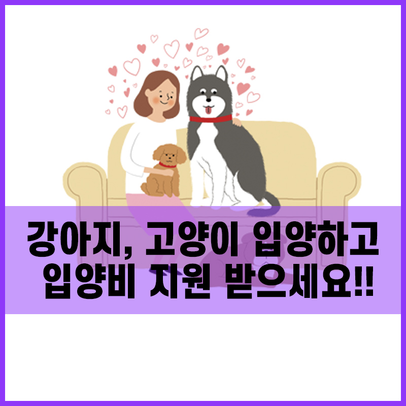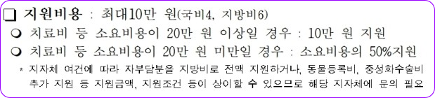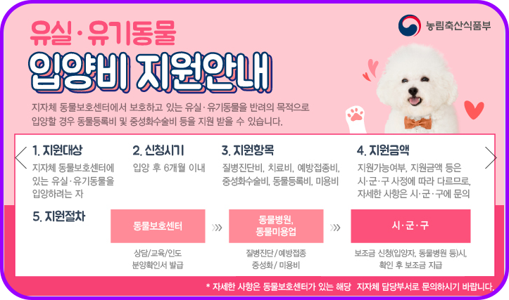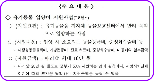 유기동물(강아지, 고양이 등) 지자체 동물보호센터에서 반려 목적으로 입양하는 사람을 대상으로 입양 시 소요되는 동물 등록비, 진료, 치료비 등(예방접종, 중성화 수술비), 미용 비등의 일부 금액을 지원합니다. 마리당 최대 10만 원의 지원금액이 있습니다. (마리당 20만 원 한도로 정부가 50% 지원, 지방자치단체 여건에 따라 조건이 다릅니다. 사시고 계신 곳의 조건을 검색하여 보시기 바랍니다.)