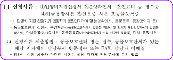 입양비 지원 신청자와 입양자가 동일인이어야 합니다. 동물보호센터 방문 접수, 동물보호단체가 있는 지자체의 담당부서 방문접수 또는 FAX 또는 담당자 이메일로 신청 가능합니다.