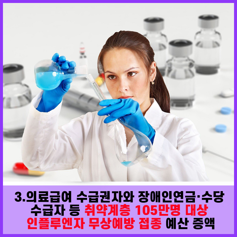 취약계층 105만명 대상 독감 무료 예방접종을 위한 예산 315억을 증액했습니다.