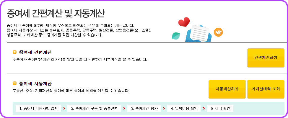 국세청 홈텍스 > 세금모의 계산> 증여세 자동계산에서 간편하게 증여세를 계산할 수 있습니다.