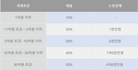 증여세는 1억원이하 10%, 5억 원 이하 20%, 10억 원 이하 30%, 30억 원 이하 40%, 30억 원 초과 50% 에 누진공제액이 있습니다. 즉 증여세는 (증여세 과세 표준 X 세율) - 누진공제액으로 계산하면 됩니다.