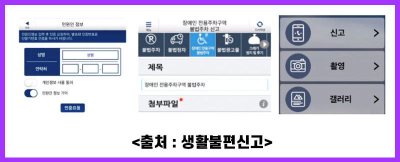 앱스토어 및 플레이스토어를 통해 생활불편신고 앱 설치후 본인인증(문자메시지)를 통해 쉽게 신고가 가능합니다. 생활불편신고어플은 장애인주차구역 위반뿐만 아니라, 불법주차, 쓰레기 방치 및 투기 등의 민원을 신고 할 수 있습니다.