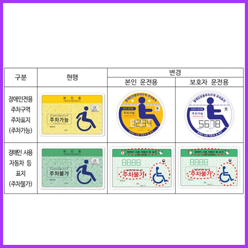 2020년부터 장애인 주차구역에 대한 단속 기준이 강화되어 장애인 주차 표지가 차량에 꼭 부착되어 있어야 하며 주차 표지가 있어도 보행장애가 있는 사람이 함께 타지 않으면 과태료 10만원이 부과됩니다. 이점 주의 하시기 바랍니다.