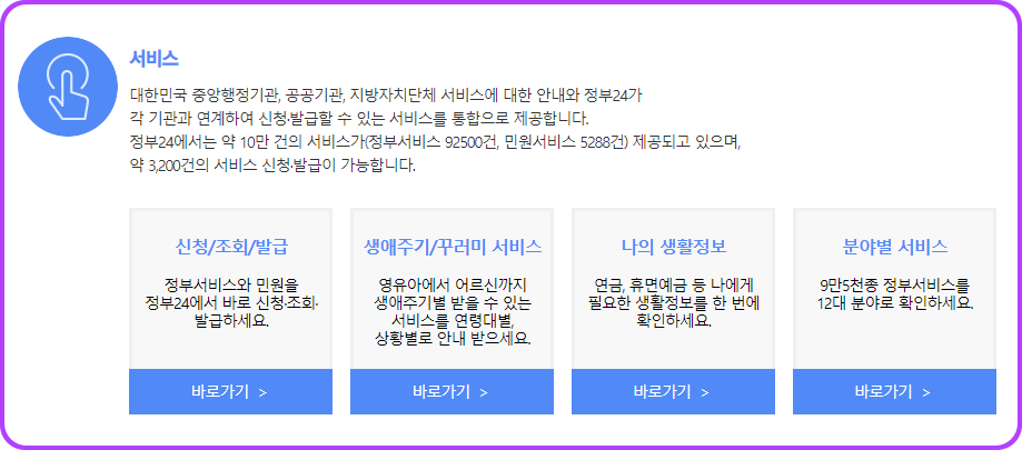 정부24에서는 약 10만 건의 서비스가(정부서비스 92500건, 민원서비스 5288건) 제공되고 있으며,