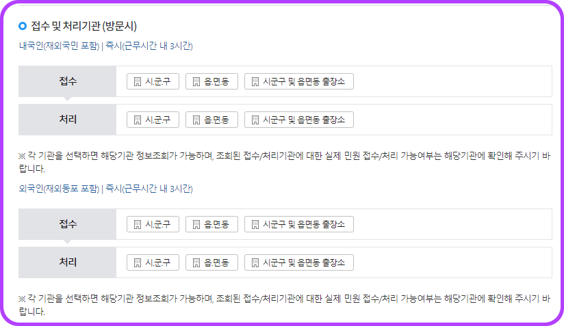 접수 및 처리 기관은 시,군,구,읍,면,동, 시군구 및 읍면동 출장소에서 가능합니다.