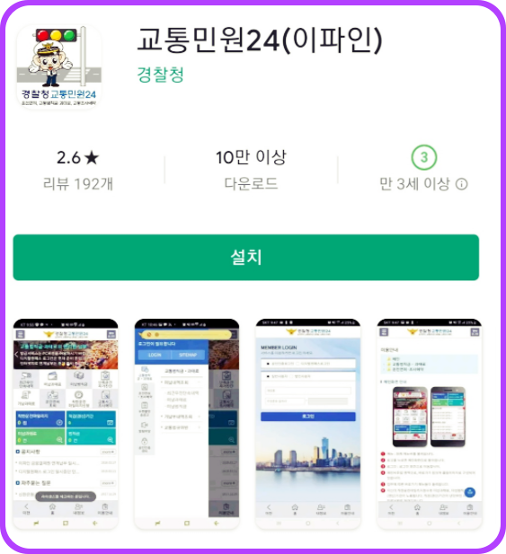 이파인은 경찰청 교통민원 24입니다. 구글 Play 스토어에서 검색 후 다운로드하거나, 링크를 통해 바로 다운이 가능합니다.