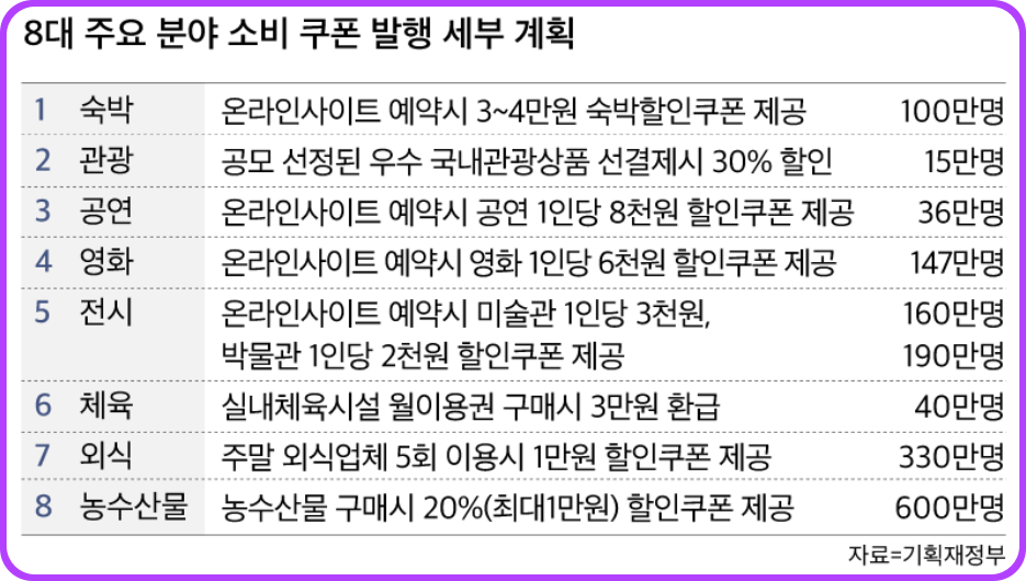 8대 소비쿠폰이란 말 그대로 8대 주요 분야에 대한 소비를 활성화 하고자 정부에서 발행하는 '쿠폰'입니다. 여기서 8대 주요 분야란 숙박, 관광, 공연, 영화, 전시, 체육시설, 외식, 농수산물, 이렇게 8개 분야를 말합니다.