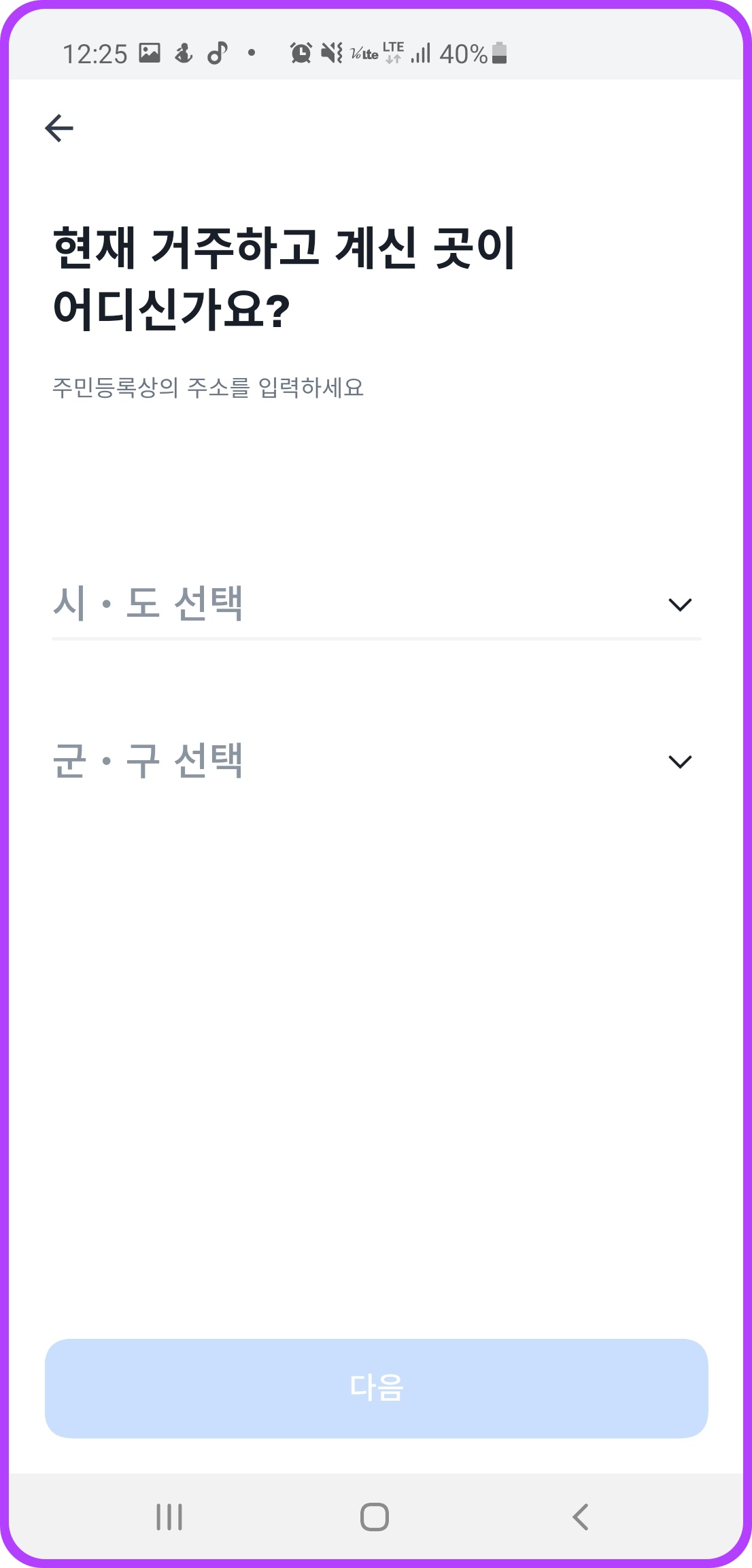 현재 거주하고 계신 곳을 선택하시면 되는데요. 이때 주민등록상의 주소를 입력하셔야 합니다.