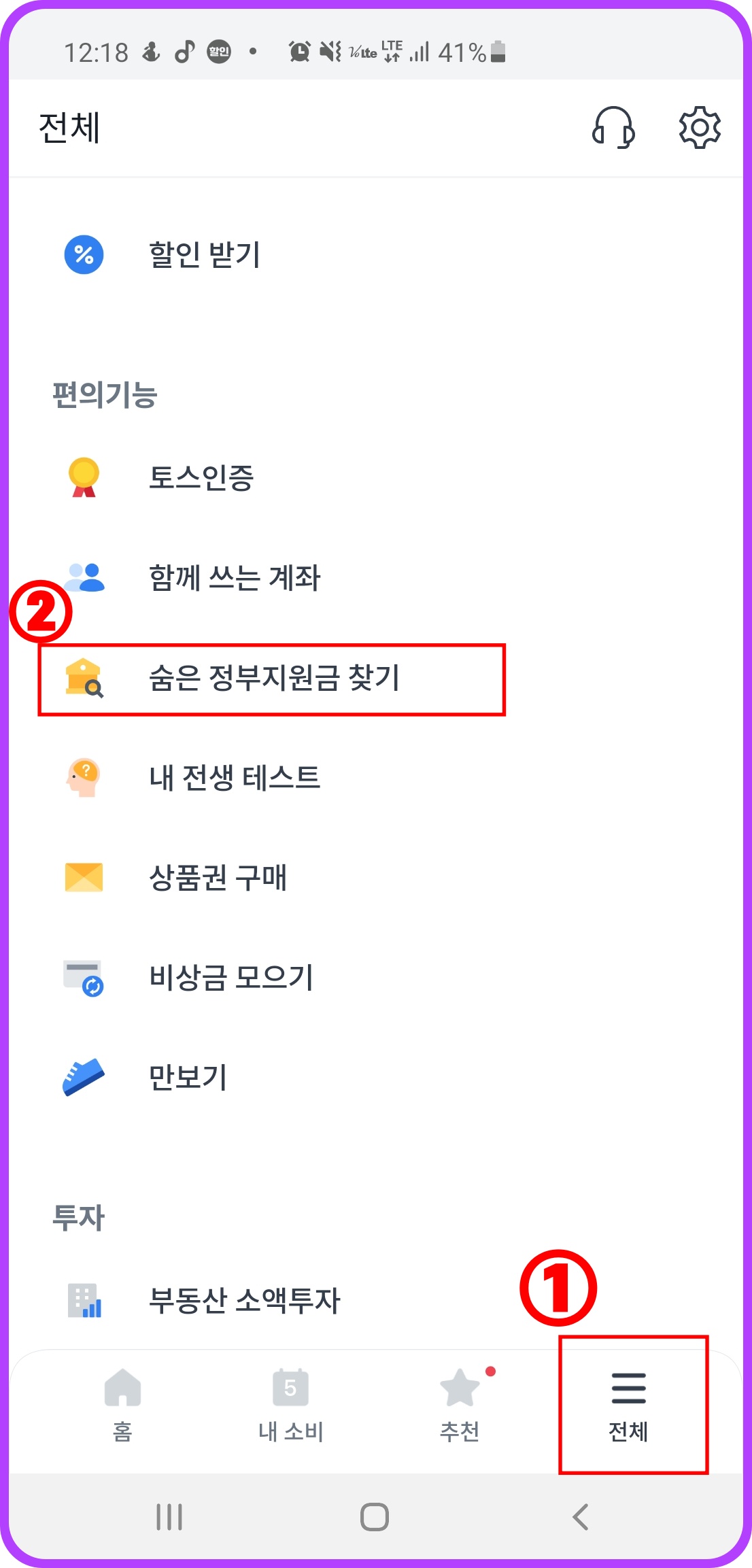 먼저 토스 어플로 들어가셔서 전체를 눌러주시고 맨 아래로 내려오시면 편의 기능에 숨은 정부지원금 찾기 메뉴가 나옵니다.