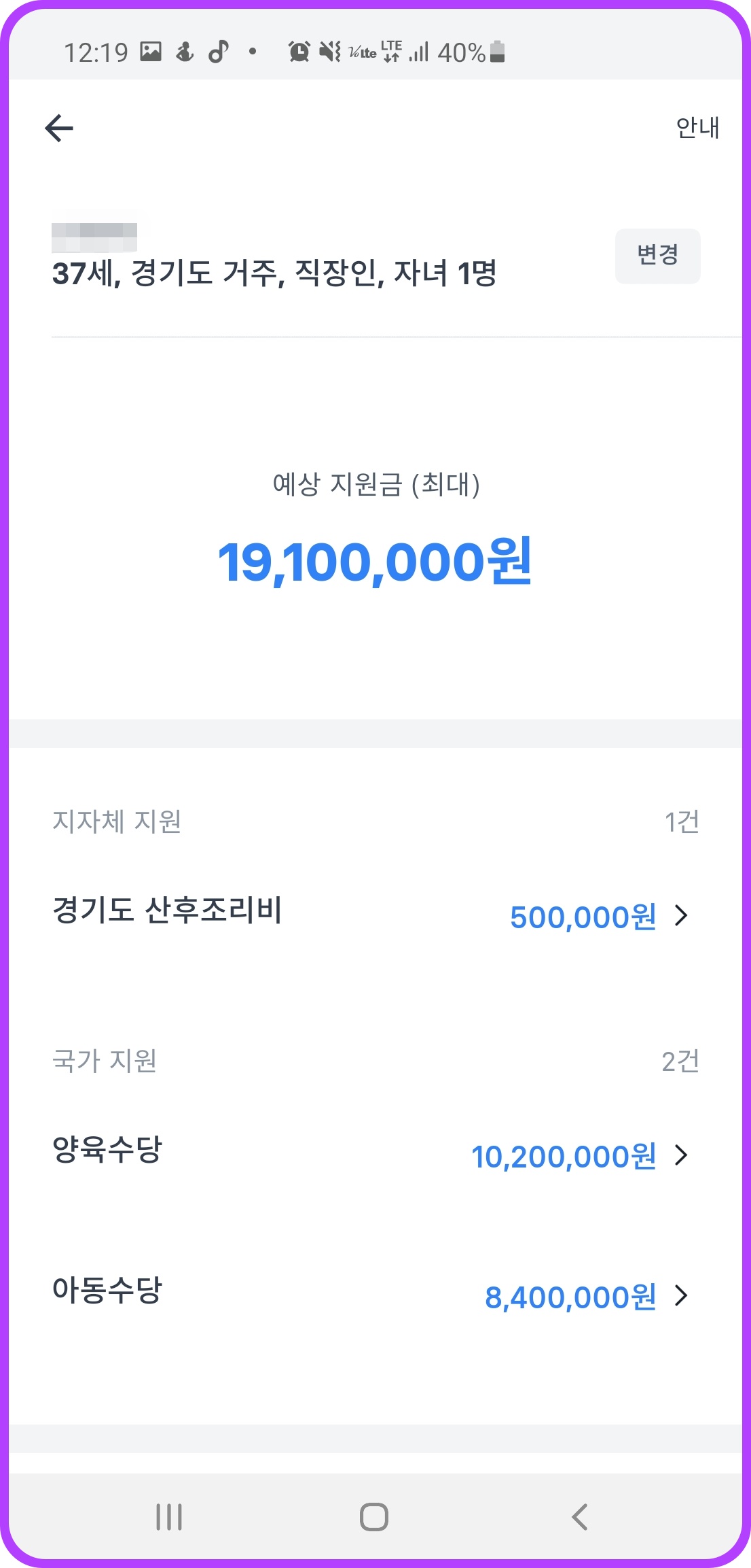 그럼 37세 경기도에 거주하시는 직장인의 경우 자녀가 1명이 있다면 최대 19,100,00원의 수혜 가능한 정부지원금이 있다고 나옵니다.
