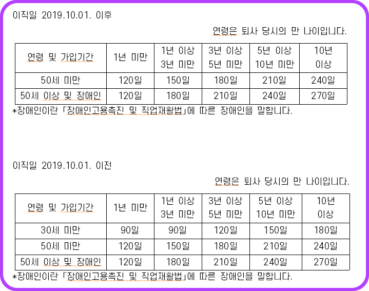 * 이직일이 2019.10.01 이전은 퇴직 전 평균임금의 50% X 소정 급여일수