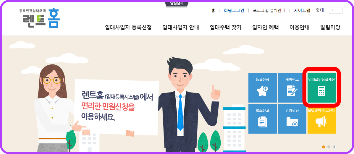 렌트홈으로 접속 후 우측에 임대료 인상률 계산을 클릭해주시면 됩니다.
