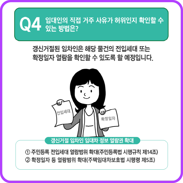 첫 번째, 세입자가 집주인의 실거주 이유로 계약갱신 요구를 거절할 경우 실제로 집주인이 거주하는지 확인할 필요가 있습니다. 그럴 때 임대차 정보를 확인할 수 있다는 것입니다.