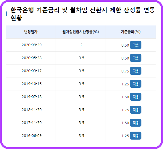 전월세 전환율 계산방법 기준 금리인 2.5%는 한국은행에서 지정한 기준금리와도 연관이 있습니다. 한국은행 기준금리 0.5%에 전월세 전환 시행령에 따른 금리 2%를 더해 총 2.5%의 전환율이 나온 것입니다. 한국은행의 기준금리가 추후에 변한다면 전월세 전환율 금리도 함께 변동됩니다.